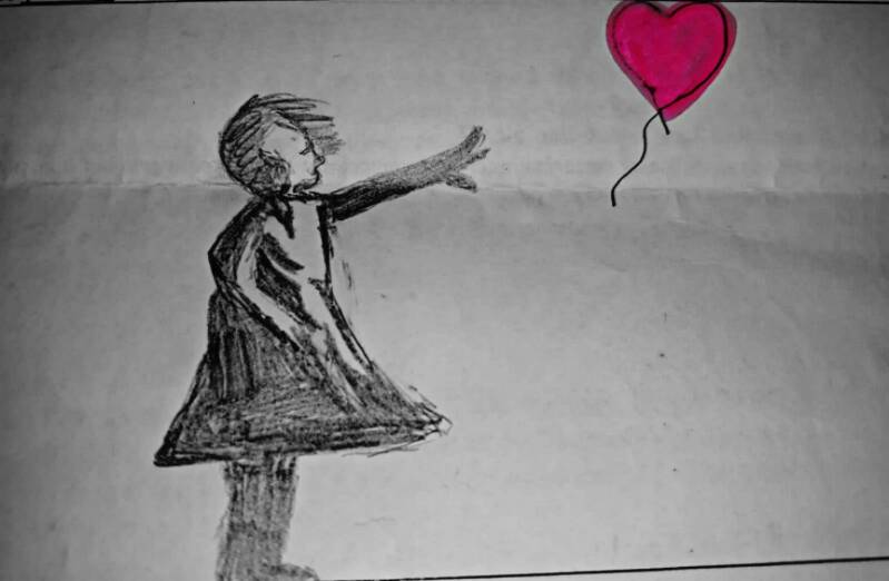Je ziet op dit kunstwerk een klein meisje staan. Ik denk van een jaar of zes. Het kleine meisje is van de zijkant getekend. Ze heeft een jurkje aan die naar voren is gewaaid door de wind. Haar haren zijn kort en worden ook naar voren geblazen door de wind, waardoor een paar haren haar gezicht half bedekken. Ze heeft haar arm omhoog, want haar ballon is weg gewaaid die ze terug wil pakken. De ballon is in de vorm van een hartje en is vel roze bijna rood gekleurd, waardoor de ballon het meest opvalt in de tekening. Het meisje word op de voorkant verlicht, dat te zien is aan de kleur wit. Haar achterkant is zwart, wat dus schaduw moet voorstellen. In dit kunstwerk heeft de kunstenaar veel met schaduw en licht gewerkt. Er komen in dit kunstwerk niet zo heel veer vormen voor. De enige vormen die mij zijn opgevallen zijn: rond, puntig, open, plat en de ballon die in de vorm van een hartje is.